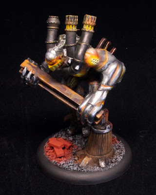 ReplyDeleteI quite like that rail golem too, I think he turned out well. I am working on a forgefiend that has glowing spots. I splash the darker color into the recess and work up to white which gives a nice effect, thinned ink over white might do it too. Some of those vents seem to be a bit small though so it may not be a good method. The vents I'm painting on my model can easily swallow a 1/0 brush!;)