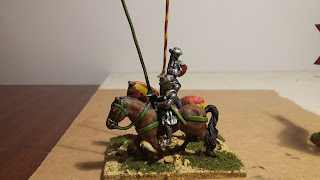 Here are 2 units of Gendarmes each of 8 mounted 28mm figures the first unit is the elderly unit in the title as they are venerable Hinchcliffe figures from long ago last century! As they were an ebay purchase the horses are from various sources and indeed as some of them came without heads I was forced to add perry heads to a couple, which have turned out surprisingly well I think. I used Hans Burgkmair's The Triumph of Maximillian as my source in painting them , I added some vines and flowers which are in other period illustrations , these are not terribly succesfull but they are done now and I'm buggered if I'm going back to them! En masse I'm happy with them and they were relatively cheap! The next batch are Old Glory and I wasn't looking forward to them but I think they have come out rather well and I enjoyed painting them, rather more geometric patterns which works well at this scale and fun with the lances, the (rather oversize looking now)banners are overpainted downloads.