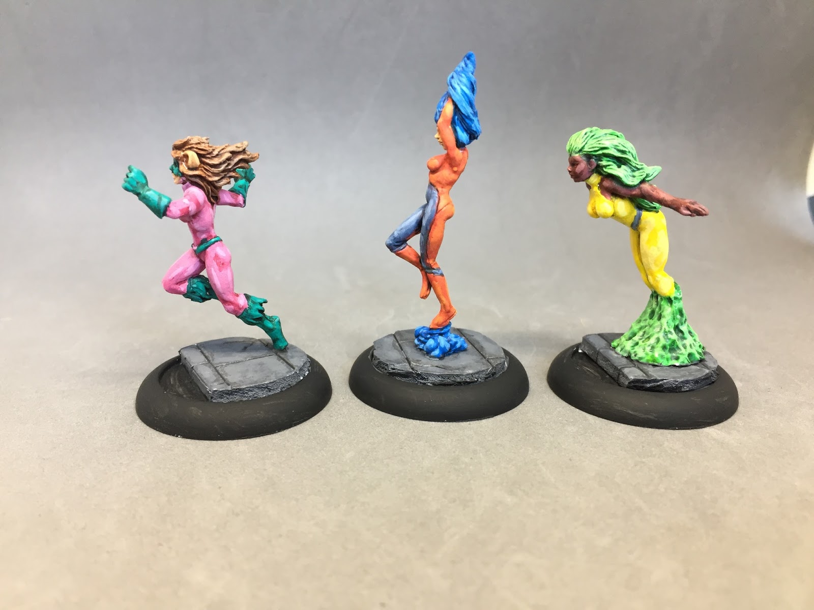 Oddly enough, I'm one of the rare few that never really took to spandex superheroes, but I readily admit these are pretty darn spectacular. I love the vibrant colours you've use for them, especially the one in yellow and green - wow, you could see her coming a mile away. I also like the bespoke concrete/flagstone bases that you made - very apropos for Pulp City.