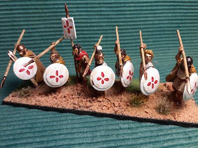 First up from Aventine Miniatures I have some Foot Light troops "Mercenary Thureophoros" - so named as they are using the oval "thureos" style shield. The book mentions white shields so painted as such. Plus I have read "White Shields" always roll higher on the dice!
